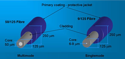 這些不同的路徑被稱為空間模式,因此描述為多模光纖。單模光纖電纜具有小芯,其僅允許光線的一條路徑穿過光纖,因此描述為單模光纖。多模光纖通常具有兩種不同的芯尺寸:50微米或62.5微米。單模電纜采用9微米玻璃芯。